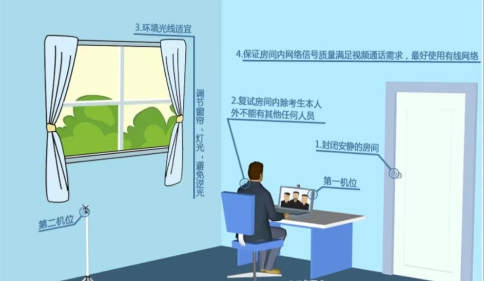 独立安静封闭房间,复试期间房间必须保持安静明亮,不得有其他人员及声音,1.5 米内无复试资料、电子设备(双机位除外),桌面仅放考生准考证、身份证、《大连医科大学硕士研究生招生考试考生网络远程复试保密承诺书》,真实背景、光线均匀,禁止虚拟背景、滤镜或更换视频背景。房间内不得有其他人,也不允许出现其他声音。